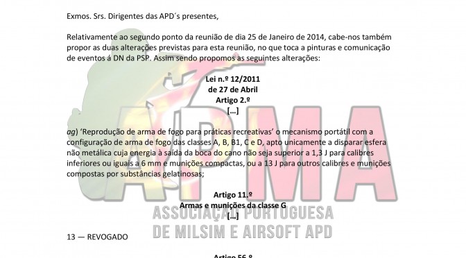 Caros Praticantes, No passado dia 25 a APMA presidiu à primeira reunião Inter-APD’s. Propusemos a abolição das pinturas, a em memorando a exclusão de qualquer tipo de descriminação em eventos de airsoft aos praticantes independentemente da APD em que estão associados. Ficam aqui as propostas que a APMA levou a reunião: 1ª Proposta Lei das … Continue a ler 1ª Reunião Inter-APD’s